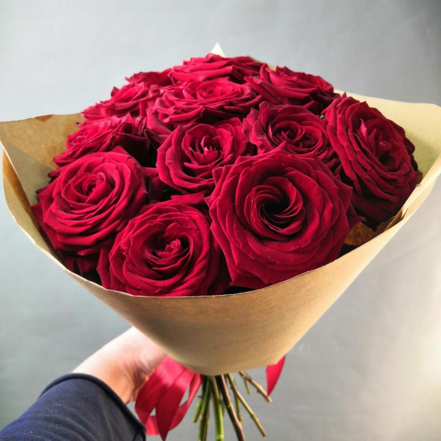 На фото букет из 13 бордовых роз. В составе: роза 13 шт, крафт-бумага 1 шт, атласная лента 1 шт, . Все цветы свежие и ароматные, букет красиво оформлен и отлично подходит для подарка. Доступна доставка цветов или самовывоз.