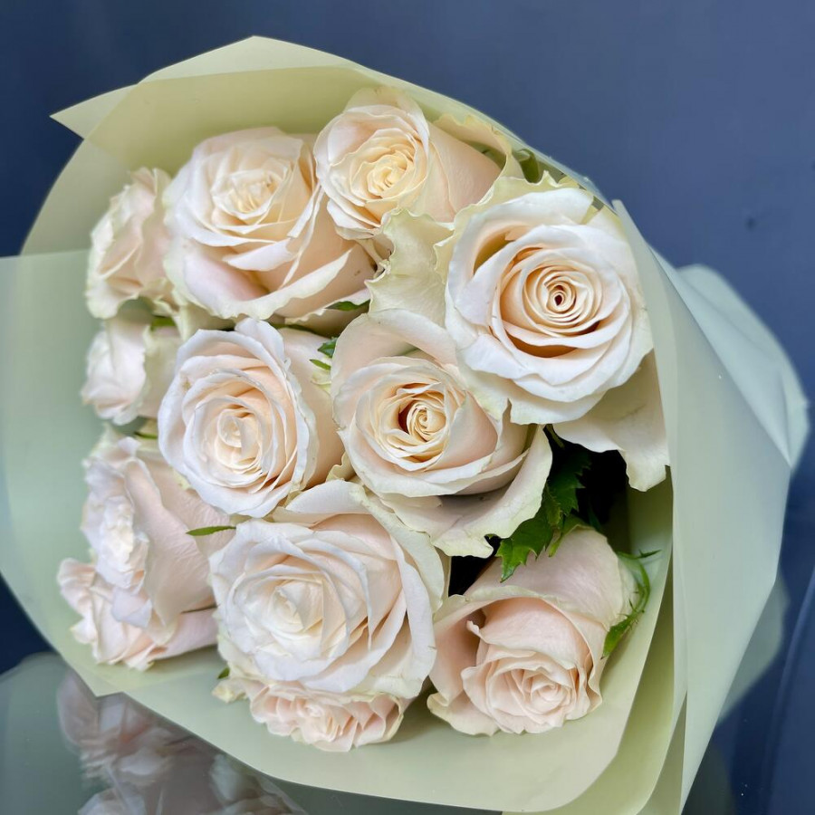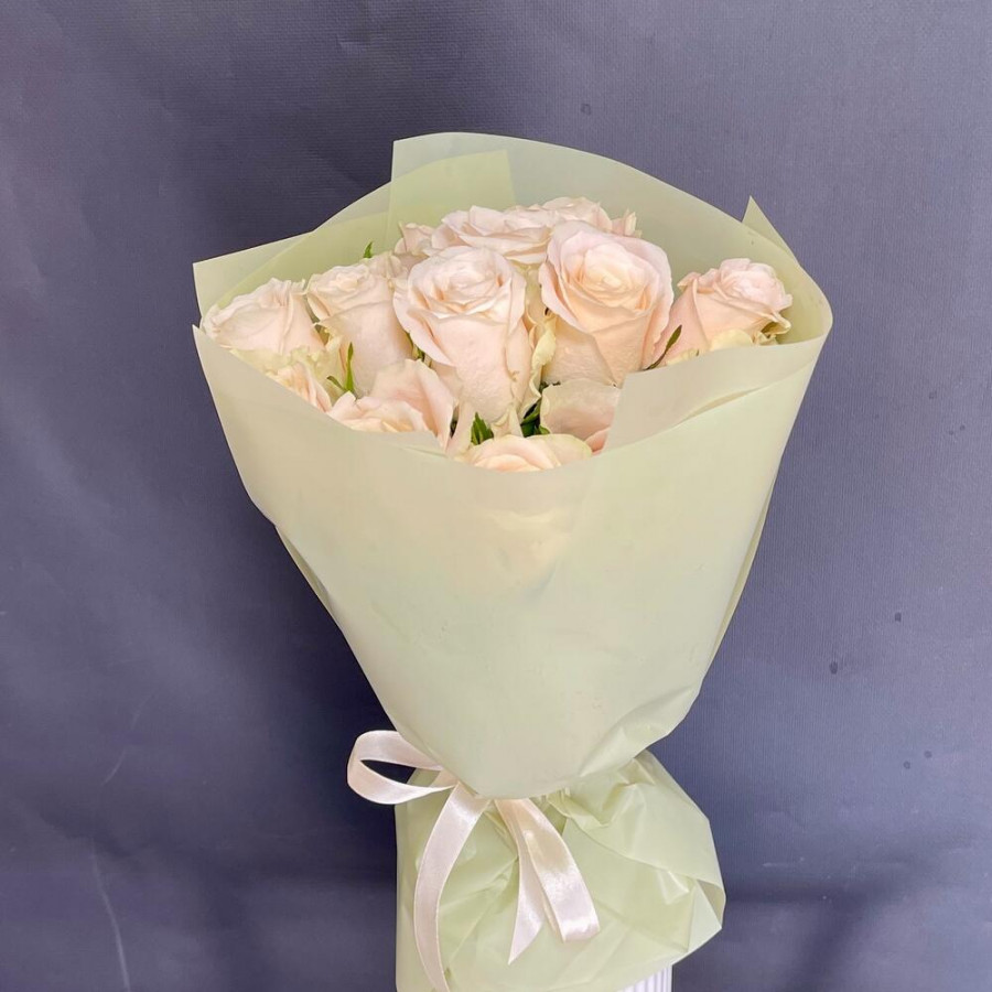 На фото букет из 13 кремовых роз. В составе: роза 13 шт, дизайнерская упаковка 1 шт, атласная лента 1 шт, . Все цветы свежие и ароматные, букет красиво оформлен и отлично подходит для подарка. Доступна доставка цветов или самовывоз.
