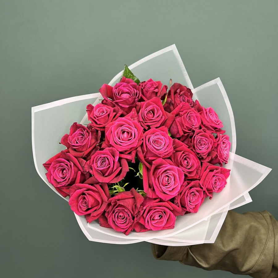 На фото букет из 21 малиновой розы. В составе: роза 21 шт, дизайнерская упаковка 2 шт, атласная лента 1 шт, . Все цветы свежие и ароматные, букет красиво оформлен и отлично подходит для подарка. Доступна доставка цветов или самовывоз.