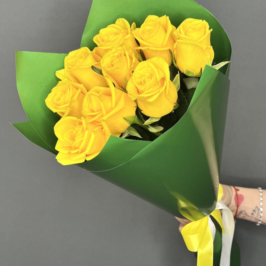 На фото букет из 9 желтых роз. В составе: роза 9 шт, дизайнерская упаковка 1 шт, атласная лента 1 шт, . Все цветы свежие и ароматные, букет красиво оформлен и отлично подходит для подарка. Доступна доставка цветов или самовывоз.