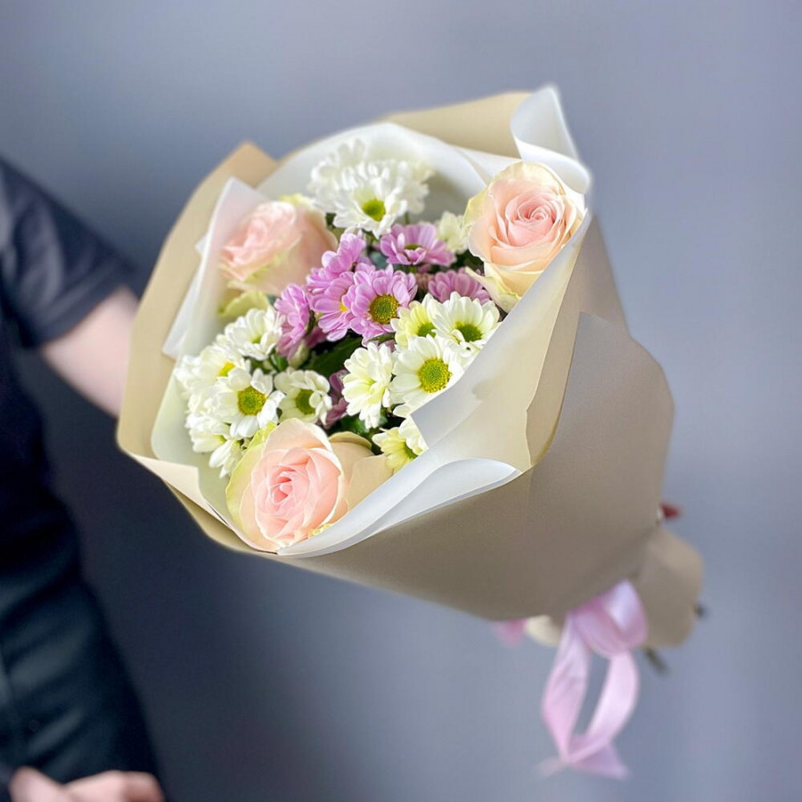 На фото букет «нежный свет». В составе: роза 3 шт, хризантема кустовая 4 шт, дизайнерская упаковка 1 шт, атласная лента 1 шт, . Все цветы свежие и ароматные, букет красиво оформлен и отлично подходит для подарка. Доступна доставка цветов или самовывоз.
